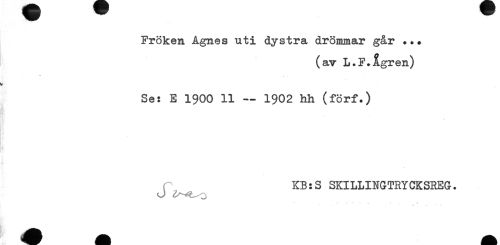 //// Fröken Agnes uti dystra drömmar går ... //// (av L.F.igren) //// Se: E 1900 11 - 1902 hh (förf.) //// KB:S SKILLINGTRYCKSREG. ////