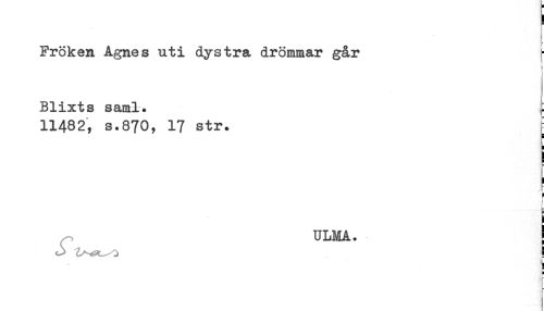 //// Fröken Agnes uti dystra drömmar går //// i //// Blixts saml. ^ //// 11482, s.870, 17 str. //// i //// : //// ULMA. [ ////