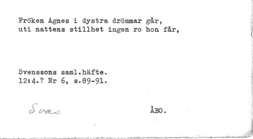 //// < //// ! //// : //// I //// Fröken Agnes i dystra drömmar går, I //// uti nattens stillhet ingen ro hon får, j //// t //// i //// i //// t //// t //// Svenssons saml.häfte. //// 12:4*? Hr 6, s.89-91* //// t //// ! //// t //// ! //// t //// - //// J ÅBO. ////