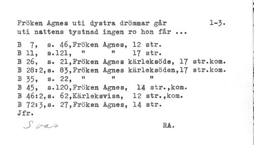 //// r //// < //// ! //// Fröken Agnes uti dystra drömmar går 1-3* //// uti nattens tystnad ingen ro hon får ... //// B 7, s. 46,Fröken Agnes, 12 str. //// B 11, s.121, " " 17 str. //// B 26, s. 21,Fröken Agnes kärleksöde, 17 str.kom. //// B 28:2,s. 83,Fröken Agnes kärleksöden,17 str.kom. //// B 35, s. 22, " " " //// B 45y s.120,Fröken Agnes, 14 str.,kom. //// B 46:2,s. 62,Kärleksvisa, 12 str.,kom. //// B 72:3,s. 27,Fröken Agnes, 14 str. //// Jfr. //// RA. //// < ////