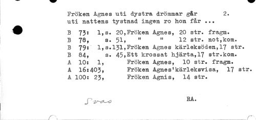 //// Fröken Agnes uti dystra drömmar går 2. //// uti nattens tystnad ingen ro hon får ... //// ^^^ B 73: l,s. 20?Fröken Agnes, 20 str. fragm. //// B 78, s. 51, " " 12 str. not,kom. //// B 79:* l,s.131,Fröken Agnes kärleksöden,17 str. //// B 84, s. 45,Ett krossat hjärta,17 str.kom. //// A 10: 1, Fröken Agnes, 10 str. fragm. //// A 16:403, Fröken Agnes'kärleksvisa, 17 str. //// A 100: 23, Fröken Agnis, 14 str. //// . J"^^ RA* ////