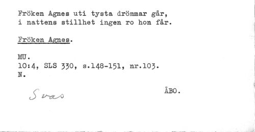 //// Fröken Agnes uti tysta drömmar går, //// i nattens stillhet ingen ro hon får. //// Fröken A^nes. //// i //// ! //// 10:4, SLS 33O, a.148-151, nr.103. //// N. //// j //// ÅBO. ////