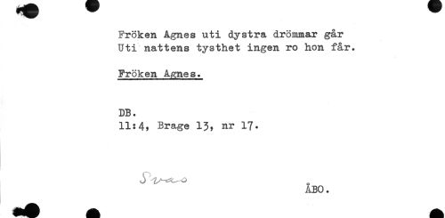 //// Fröken Agnes uti dystra drömmar går //// Uti nattens tysthet ingen ro hon får. //// Fröken A^nes. //// DB. //// 11:4, Brage 13, 17* //// J //// ^YBO. ////