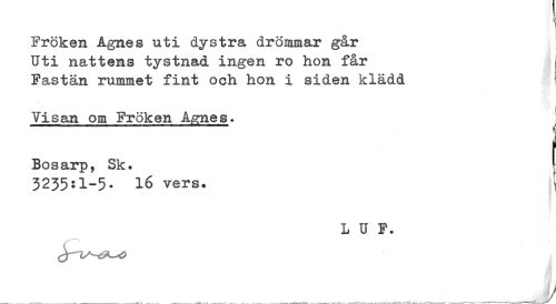//// Fröken Agnes uti dystra drömmar går //// Uti nattens tystnad ingen ro hon får //// Fastän rummet fint och hon i siden klädd //// Visan om Fröken A^?nes. ^ //// Bosarp, Sk. ^ //// 3235:1-5. 16 vers. ^ //// L U F. ////