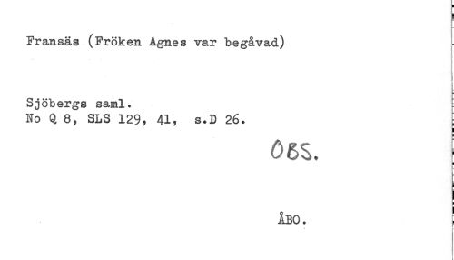 //// ] //// Fransäs (Fröken Agnes var begåvad) //// . //// Sjöbergs saml. //// No Q 8, SLS 129? 41? s.D 26. //// ! //// oss. //// i //// ÅBO. ////