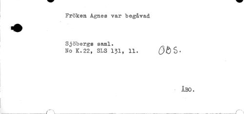 //// ! Fröken Agnes var begåvad //// Sjöbergs saml. //// No K. 22, SLS 131, 11. (566* //// ÅBO. //// _r.....\ _ _____ ___ ////