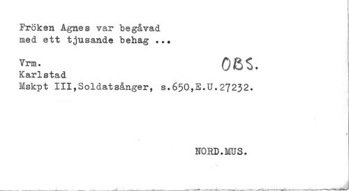 //// Fröken Agnes var begåvad //// med ett tjusande behag ... //// vi-M- oas. //// Karlstad //// Mskpt III?Soldatsånger, s.650,E.U.27232. //// i //// ! //// * //// NORD.MUS. //// .. * ////
