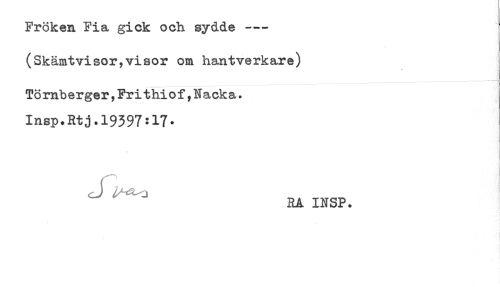 //// Fröken Fia gick och sydde--- //// (Skämtvisor,visor om hantverkare) //// Törnberger,FrithiofyNacka. //// Insp.Rtj.19397:17* //// RA INSP. ////