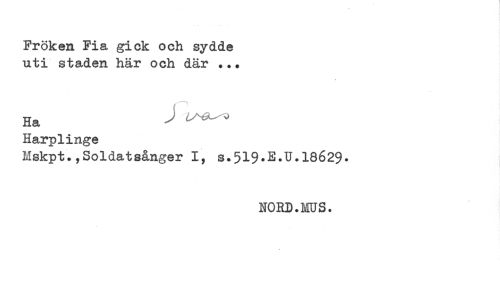 //// Fröken Fia gick och sydde //// uti staden här och där ... //// Ha ^ ^^ //// Harplinge //// Mskpt.,Soldatsånger 1, S.519.E.U.18629* //// NORD.MUS. ////