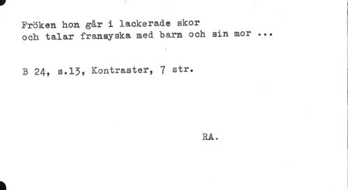 //// Fröken hon går i lackerade skor //// och talar fransyska med barn och sin mor ... //// t //// B 24, s.13? Kontraster, 7 str. //// : //// RA. ////