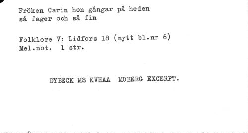 //// Fröken Carin hon gångar på heden //// så fager och så fin //// Folklore V: Lidfors 18 (nytt bl.nr 6) //// Mel.not. 1 str. //// DYBECK HS KVHAA MOBERG EXCERPT. ////