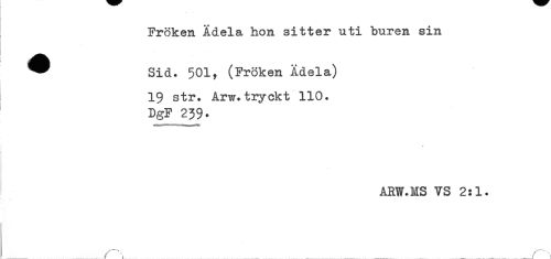 //// Fröken Adela hon sitter uti buren sin //// ^ Sid. 501, (Fröken Ädela) //// 19 str. Arw. tryckt 110. //// ' DgF 239. //// ARW.MS VS 2:1. ////
