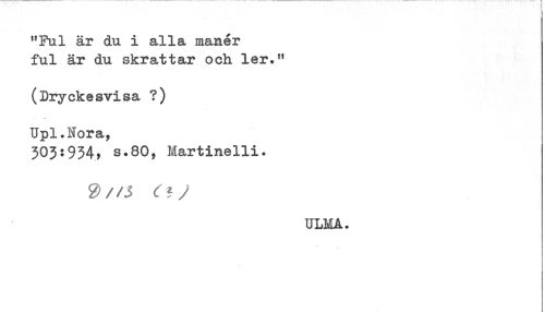//// "Ful är du i alla maner //// ful är du skrattar och ler." //// (Dryckesvisa ?) //// Upl.Nora, //// 303:934? s.80, Martinelli. //// ULMA. ////