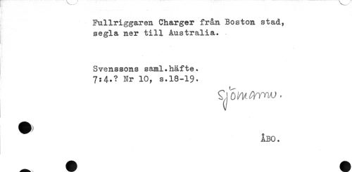 //// Fullriggaren Charger från Boston stad, //// segla ner till Australia. //// Svenssons saml.häfte. //// 7:4.? Nr 10, s.18-19* //// ^ ÅBO. ////