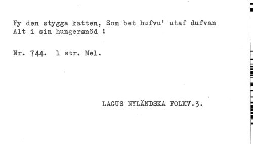 //// Fy den stygga katten, Som bet hufvu' utaf dufvan //// Alt i sin hungersnöd i //// ! //// Nr. 744. 1 str. Mel. r //// - //// F //// LAGUS NYLÄNDSKA FOLKV.3. ^ //// s ////