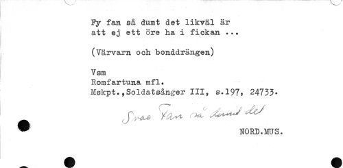 //// - //// Fy fan så dumt det likväl är //// att ej ett öre ha i fickan ... //// (Värvarn och bonddrängen) //// V sm //// Romfartuna mfl. //// Nskpt.,Soldatsånger III, s.l$7y 24733* //// ^ NORD. ms. ////