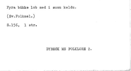 //// Fyra bäkke lob med i sumu keldu. ^ //// (Sv.Folkmel.) //// t //// S.156, 1 str. ! //// f //// : //// DYBECK MS FOLKLORE 2. //// _ _ ____... ////