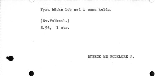 //// Fyra bäcke lob ned i suam keldu. //// i //// i //// j (Sv.Folkmel.) //// S.96, 1 str. //// * //// i //// i //// I //// i //// ^ DYBECK MS FOLKLORE 2. //// ] //// i //// i //// } ////
