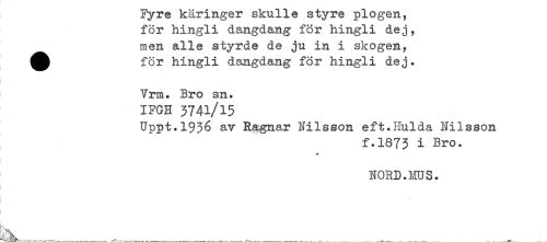 //// Fyre käringar skulle styre plogen, //// för hingli dangdang för hingli dej, //// men alle styrde de ju in i skogen, //// ^^ för hingli dangdang för hingli dej. //// Vrm. Bro sn. //// IFGH 3741/15 //// Uppt.1936 av Ragnar Nilsson eft.Hulda Nilsson //// f.1873 i Bro. //// * //// NORD.MUS. //// I //// __ ////