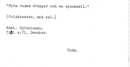 //// "Fyra raska drängar och en symamsell." //// (Polsktextor, med mel.) //// Sdml. Bjömlunda, //// 7431 s.71, Dencker. //// ULMA. ////
