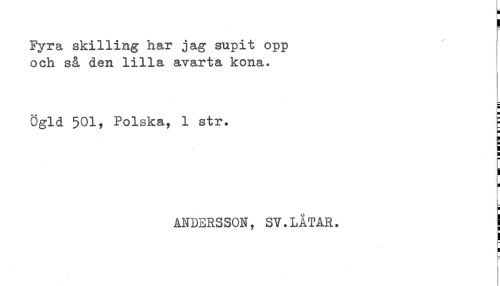 //// Fyra skilling har jag supit opp //// och så den lilla avarta kona. //// H //// Ögld 501, Polska, 1 str. F //// H //// H //// 5 //// < //// H //// ANDERSSON, SV.LÅTAR. I //// t ////