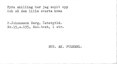 //// Fyra skilling har jag supit opp //// Och så den lilla svarta kona //// P.Johansson Berg, Östergtld. //// Nr.15yS.195* End.texty i str. //// MUS. ÅK. FOLKHEL. //// i ////
