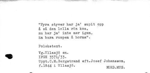 //// "Fyra styver har ja* supit opp //// å så den lella roa koa? //// nu har ja' inte mer igen, //// än bara rumpen å hörna". //// Polsketext. //// ._ Vg.Ullasjö sn. //// IFGH 3571/33. //// Uppt.C.M.Bergstrand eft.Josef Johansson, //// f.1844 i Ullasjö. NORD.MUS. ////