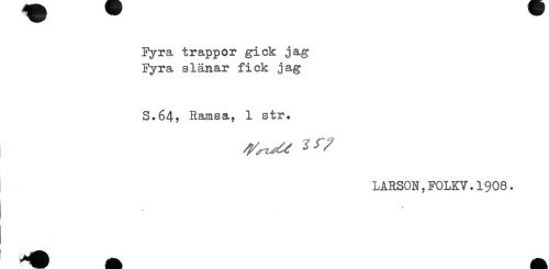 //// Fyra trappor gick jag //// Fyra slänar fick jag //// S.64, Ramsa, 1 str. //// LARSON,FOLKV.l908. //// % ////