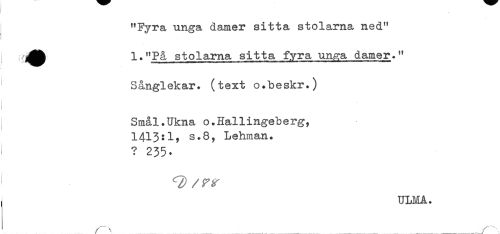 //// "Fyra unga damer sitta stolarna ned" //// ! 1. "På stolarna sitta fyra un^a damer." //// Sånglekar, (text o.beskr.) //// Smål.Ukna o.Hallingeberg, //// 1413:s.8y Lehman. //// ? 235* //// . ULHA. ////