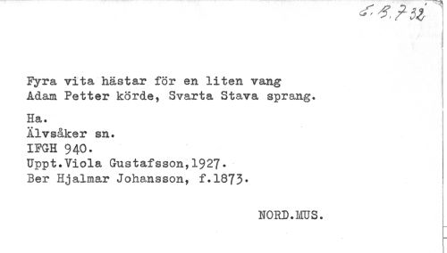 //// Fyra vita hästar för en liten vang //// Adam Petter körde, Svarta Stava sprang. //// Ha. //// Älvsåker sn. //// IFGH 940. //// Uppt.Viola Gustafsson,1927. //// Ber Hjalmar Johansson, f.1873* //// NORD.MUS. ////