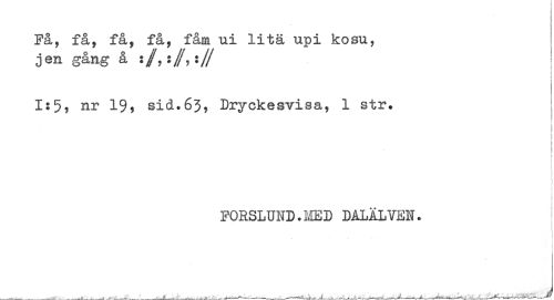 //// Få, få, få, få, fåm ui litä upi kosu, //// jen gång å //// 1:5, nr 19, sid.63, Dryckesvisa, 1 str. //// i //// j //// FORSLUND.MED DALÄLVEN. //// t //// ^ ////