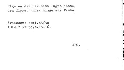 //// Fågelen den har sitt lugna näste, //// den flyger under hinuaelens fäste, //// Svenssons saml.häfte ^ //// 10:4,? Nr 33,s.15-16. * //// ÅBO. j* //// = //// i ////