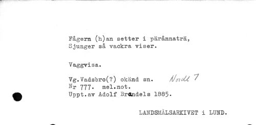 //// Fågern (h)an setter i pärånnaträ. //// Sjunger så vackra viser. //// Vaggvisa. //// Vg. Vadsbro(?) okänd sn. ^ //// Ny 777. mel.not. //// ^ Uppt.av Adolf BrAndels 1885. //// LÅNDSmLLSÅRKIVET i LUND. ////