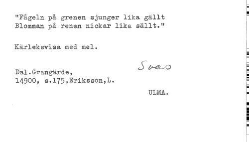 //// "Fågeln på grenen sjunger lika gällt //// Blomman på renen nickar lika sällt." //// Kärleksvisa med mel. //// ^a^o E //// Dal.Grangärde, g //// 14900, s.l75yEriksson,L. - //// UL^IA. ^ ////