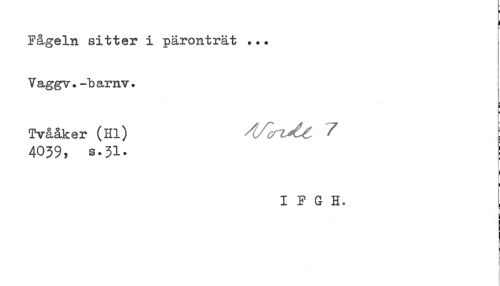 //// Fågeln sitter i päronträt ... //// Vaggv.-barnv. //// Tvååker (Hl) ^ //// 4039, s + 3-L. //// I F G H* t ////