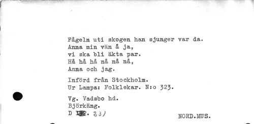 //// ^ * //// t * . //// t //// Fågeln uti skogen han sjunger var da. //// Anna min vän å ja, //// vi ska bli äkta par. //// Hå hå hå nå nå nå, //// Anna och jag. //// Införd från Stockholm. //// Ur Lampa: Folklekar. N:o 323* //// ^^ Vg. Tadsbo hd. //// Björkäng. //// D NORD.MUS. ////