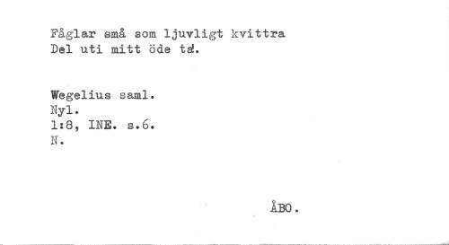 //// Fåglar små som ljuvligt kvittra //// Del uti mitt öde ta!. //// Wegelius saml. //// Nyl. //// 1:8, INE. s.6. //// N. //// ÅBO. ////