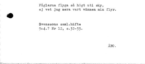//// Fåglarna flyga så högt uti sky, //// ej vet jag mera vart vännen min flyr. //// Svenssons saml.häfte //// 9:4.? Nr 12, s.32-33- //// ÅBO. ////