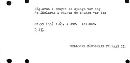 //// Fåglarna i skogen de sjunga var dag //// ja fåglarna i skogen de sjunga var dag //// Nr.59 (53) s.65y 1 str. mel.not. //// D 231. //// HELLGREN SÅNGLEKAR FR.NÄÄS II. ////
