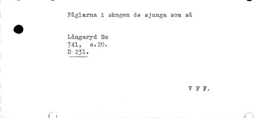 //// ; Fåglarna i skogen de sjunga som så //// Långaryd Sm //// 741, s.20. //// D 231. //// ) //// V F F. //// r) r*i ////