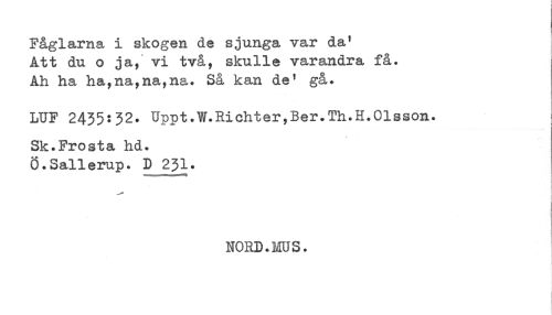 //// Fåglarna i skogen de sjunga var da* //// Att du o ja, vi två, skulle varandra få. //// Ah ha ha,na,na,na. Så kan de* gå. //// LUF 2435:32. Uppt.W.Richter,Ber.Th.H.Olsson. //// Sk.Frosta hd. //// Ö.Sallerup. D 231. ////