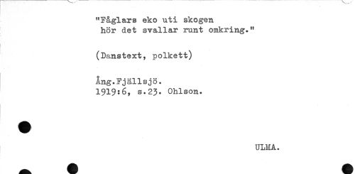 //// "Fåglars eko uti skogen //// hör det svallar runt omkring." //// (Danstext, polkett) //// Ång.Fjällsjö. //// 1919:6, s.23. Ohlson. ////
