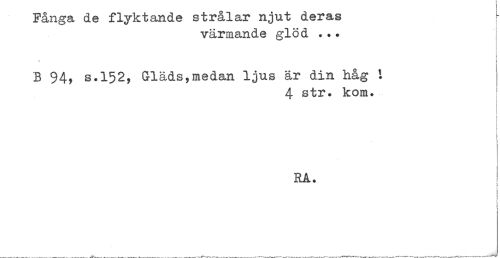 //// Fånga de flyktande strålar njut deras //// värmande glöd ... //// B 94, S.152, Gläds,medan ljus är din håg 1 //// 4 str. kom. //// RA. ////