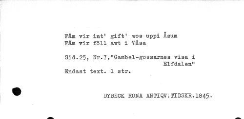 //// Fåm vir inf gift' wos uppi Asum //// Fåm vir föll awt i Vasa //// Sid.25, Nr.7?"Gambel-gossames visa i //// Elfdalen" //// Endast text. 1 str. //// ^ DYBECK RUNA ANTIQy.TIDSKR.l845. //// v ////