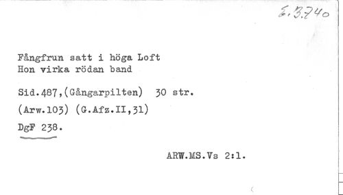 //// Fångfrun satt i höga Loft //// Hon virka rödan band //// Sid.487,(Gångarpilten) 30 str. //// (Arw.103) (G.Afz.11,31) //// DgF 238. //// ARW.MS.Vs 2:1. ////