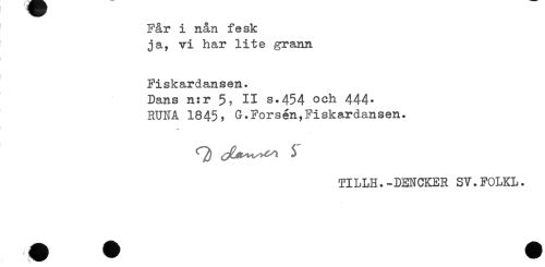 //// Får i nån fesk //// ja, vi har lite grann //// i //// Fiskardansen. //// Dans n:r II s.454 och 444. //// RUNA 1845, G.Forsen,Fiskardansen. //// * //// TILLH.-DENCKER SV.FOLKL. ////