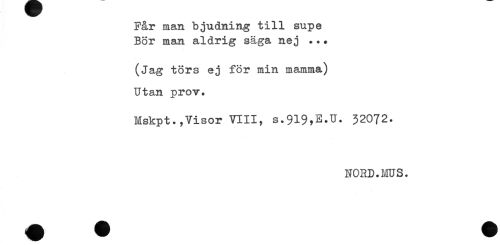 //// Får man bjudning till supe //// Bör man aldrig säga nej ... //// (Jag törs ej för min mamma) //// Utan prov. //// Mskpt.,Visor VIII, s.919,E.U. 32072. //// NORD. ms. ////