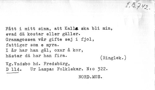 //// Fått i mitt sinn, att Kalla, ska bli min, //// i //// evad dä kostar eller gäller. //// Granngossen vår gifte sej i fjol, //// fattiger som e myra. //// I år har han gål, oxar å kor, //// hästar dä har han fira. (Ringlek.) //// Vg.Vadsbo hd. Fredsbärg, //// D 114. Ur Lampa: Folklekar. N:o 322. ////