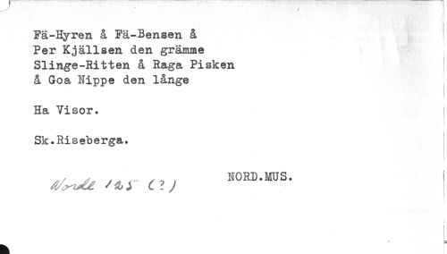 //// Fä-Hyren å Fä-Bensen å //// Per Kjällsen den grämme //// SIinge-Ritten å Raga Pisken //// å Goa Nippe den långe //// Ha Visor. ! //// Sk.Riseberga. //// ) //// ^ ^ i NORD.MUS. ////
