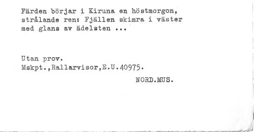//// Färden börjar i Kiruna en höstmorgon, //// strålande ren: Fjällen skimra i väster //// med glans av ädelsten ... //// ! //// i //// f //// Utan prov. //// Mskpt.,Rallarvisor,E.U.40975 - //// NORD.MUS. //// i //// ! ////